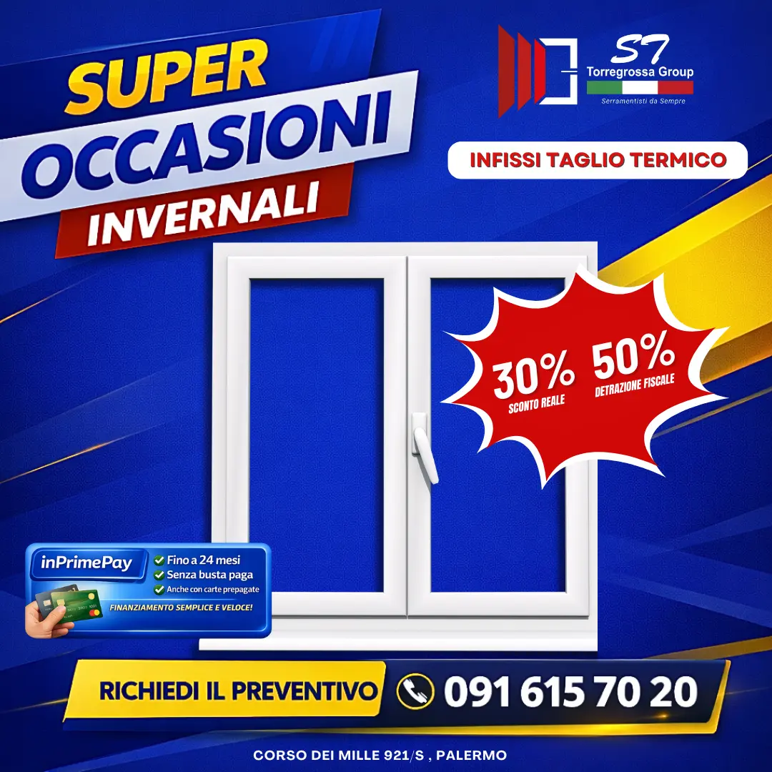 Infissi taglio termico Scopri la promozione di ST Torregrossa Group: INFISSI TAGLIO TERMICO SCONTO DEL 30% + 50% Pagamento anche con Pagolight Compass.Visita il nostro showroom in Corso dei Mille 921/S – Palermo o chiama 091 615 70 20 per richiedere informazioni o fissare un appuntamento.